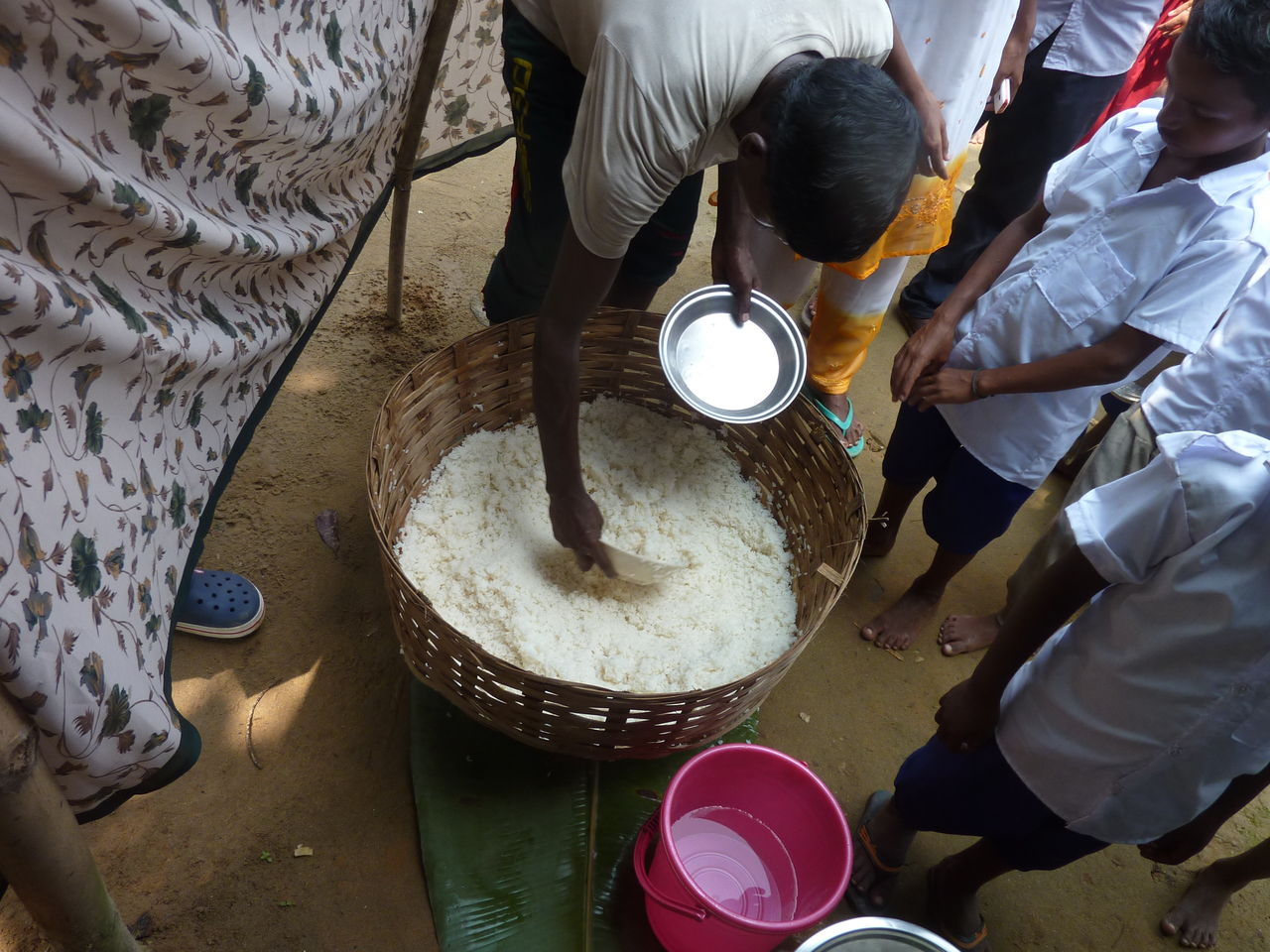 この日も、子どもたちとのHappy Plateランチ、チキンカレーをプレゼントしました。大きな竹かごにご飯が運ばれてきました。調理場では、大きな鍋にチキンカレーが作らています。もちろん、ダルスープも忘れずに!jこの日は村の一大イベント、卒業生たちも仕事を休んでランチを作ってくれました。これまで、あまり食べたことのないようなごちそうに、子どもたちからも笑顔がこぼれます。小さな体には食べきれないほどのご飯が盛られていましたが、一粒も残すまい、とゆっくりゆっくり、でも丁寧に口に運ぶ小さな子どもの姿が印象的でした。
